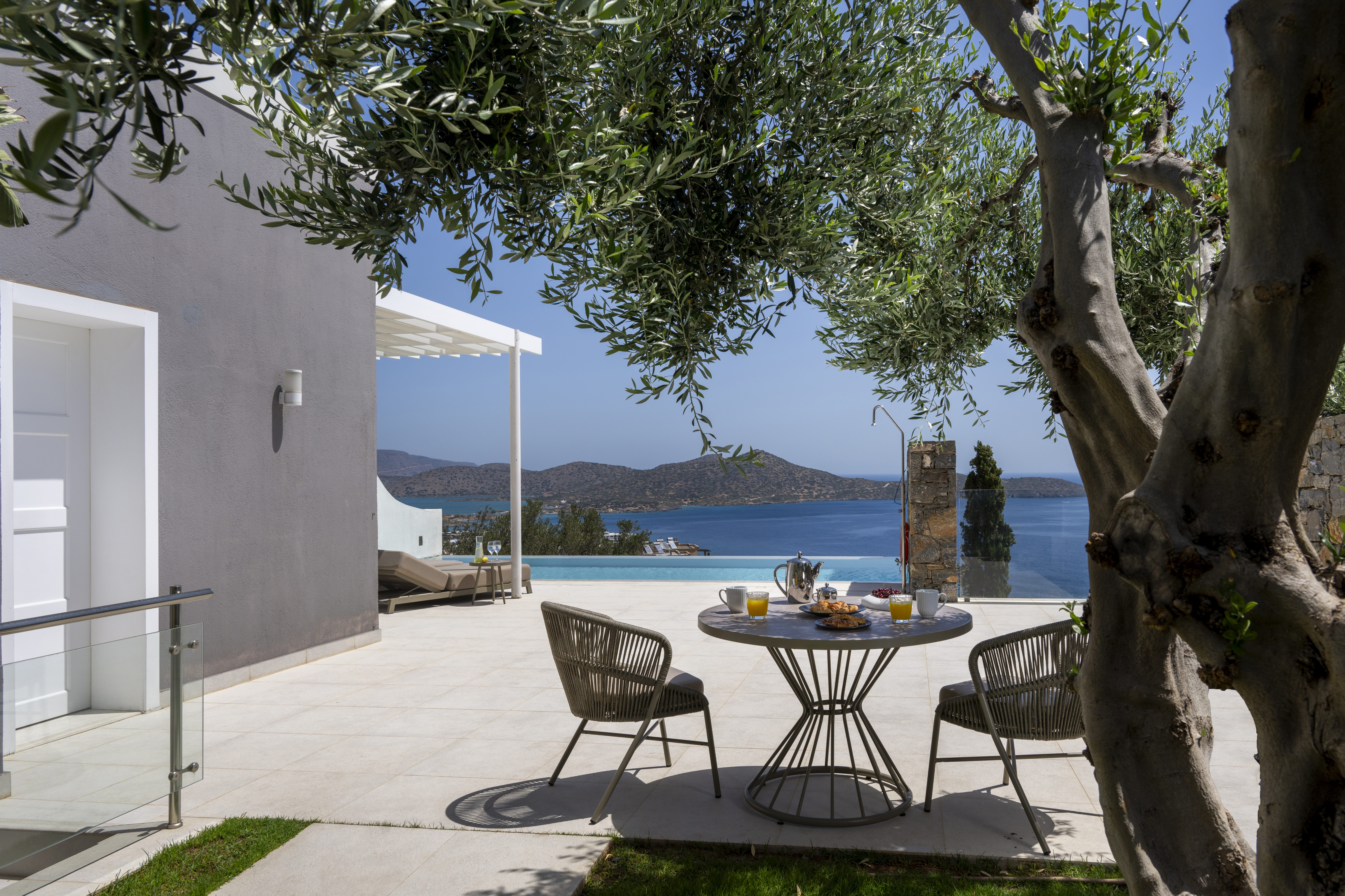 Our One-Bedroom Sea View Serenity Pool Suite blends contemporary elegance with sweeping views over the Gulf of Mirabello. Designed for couples, it features an open-plan bedroom with a double bed, a sitting area, and a marble-lined bathroom with a skylight that fills the space with natural light. Outside, a private infinity pool with hydro/air-massage features invites complete relaxation, while the sun terrace with loungers is perfect for enjoying the panoramic views. The pool’s ambient lighting system allows you to set atmospheric multi-color effects for personalized evening moments. Inside, the suite includes a 55” smart TV, espresso machine, small fridge, and complimentary high-speed Wi-Fi for a seamless and comfortable stay.
