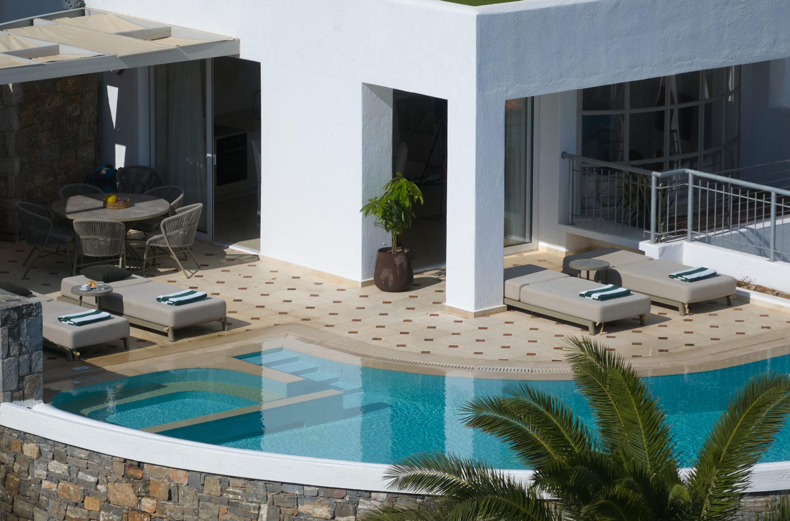 Outdoors, a spacious terrace invites relaxation with a private pool with Jacuzzi, sunbeds, and a comfortable seating area—perfect for enjoying the Cretan sun and the villa’s sweeping panoramic views.